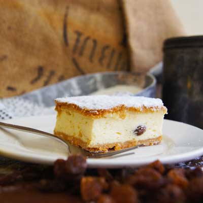 Hou je van cheesecake? Probeer de Oostenrijkse variant: Käsekuche. Het wenerdeeg vormt de bodem en de deksel van de subtiel gezoete kwark met rozijnen en een vleugje citroen. Een stevig gebakje met een frisse smaak!